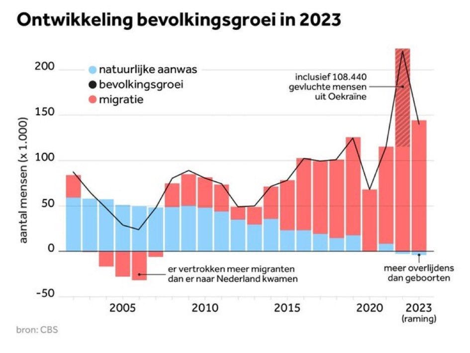 Nederland groeit, en hoe! Aangezien er sinds enige jaren geen sprake is van natuurlijke aanwas, zelfs nu meer overlijdens dan geboorten, komt de snelle groei voor nu meer van 100% voor rekening van immigratie. Het is geen geheim dat Nederland immigratie wenselijk acht gezien de miljarden, geschat wordt jaarlijks €25 miljard, uitgeeft aan de opvang en onderbrengen van immigranten. Nederland wil dan ook niet alleen de afname van de autochtone bevolking compenseren, maar zelfs fors groeien. Het Planbureau verwacht groei naar bijna 20 miljoen inwoners tegen 2050. Met een afnemende autochtone bevolking kan dat alleen maar door aanhoudende, gewilde, grootschalige immigratie.
